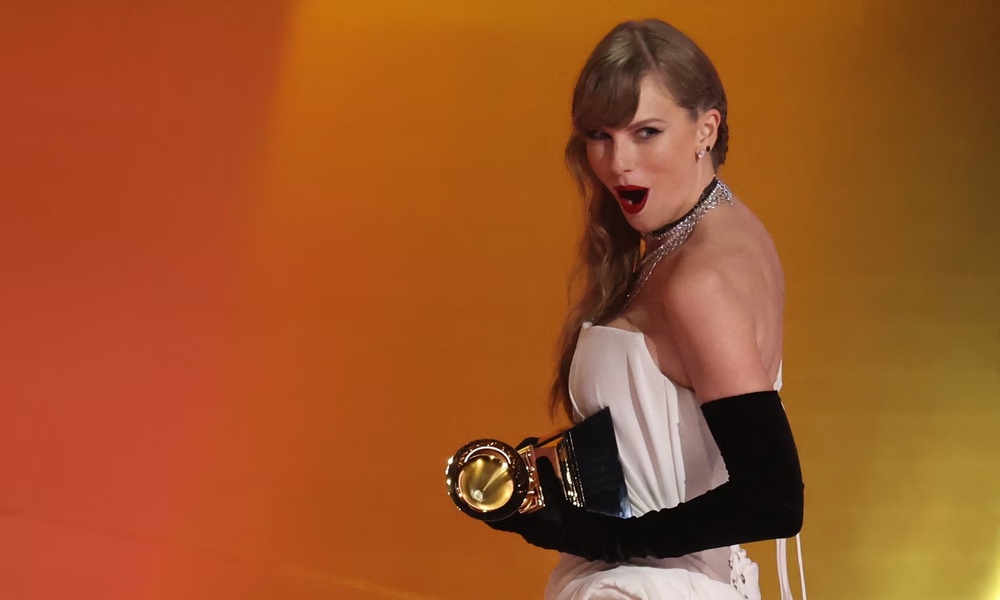 Taylor Swift accepts the award for best pop vocal album at the Grammys. She has announced her next album, The Tortured Poets Department, will be released on 19 April. Photograph: Mike Blake/Reuters