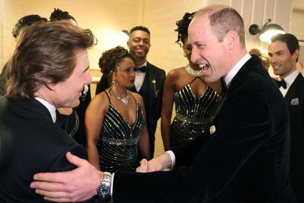 Britain's Prince William, the Prince of Wales, right, reacts as he speaks with US actor Tom Cruise, at the London Air Ambulance Charity Gala Dinner at The OWO in central London, Wednesday, Feb. 7, 2024. (Daniel Leal/Pool Photo via AP)