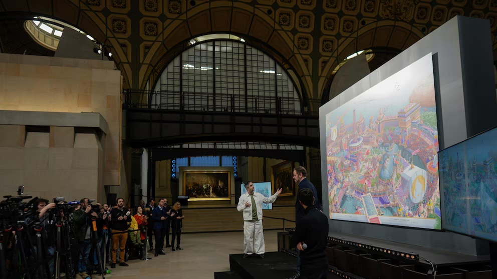 The posters were unveiled on Monday at the Musee d’Orsay — a former railway station transformed into an imposing museum stretching along the Seine River — in the presence of Paris 2024 director of design Joachim Roncin and the artist behind them, Ugo Gattoni.