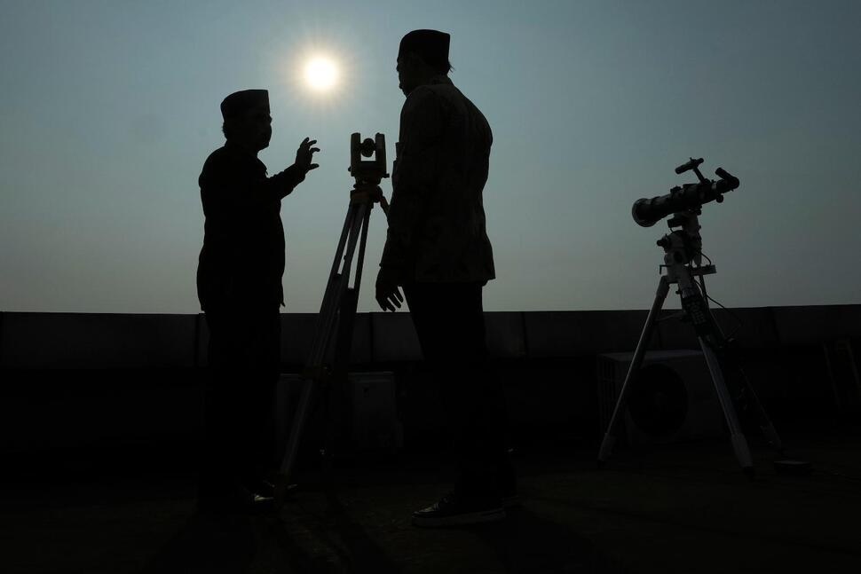 FILE - Officials are silhouetted as they use a telescope to scan the horizon for a crescent moon that will determine the beginning of the holy fasting month of Ramadan in Jakarta, Indonesia, Wednesday, March. 22, 2023. (AP Photo/Achmad Ibrahim, File)