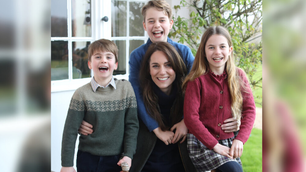 The photo shows the Princess of Wales sitting on a garden chair, dressed in jeans, a sweater and a dark jacket, smiling, surrounded by her three laughing children, George, Charlotte and Louis.