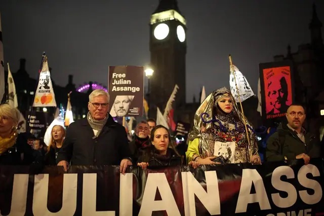 His supporters marked the anniversary by protesting outside the Australian High Commission in central London, holding banners reading "Free Assange".