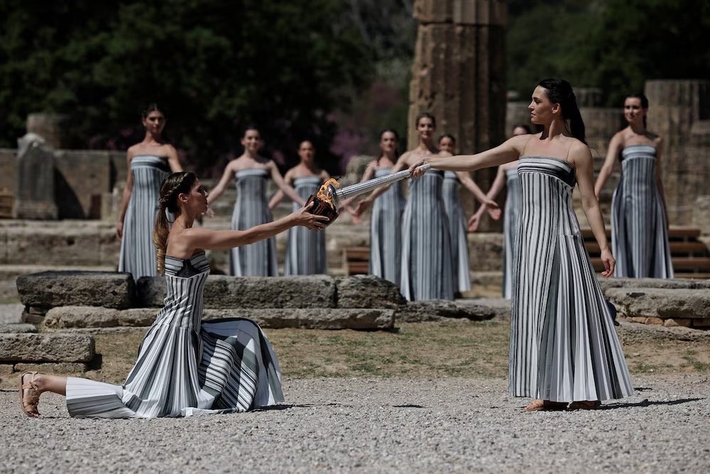 The flame is eventually used to light the first runner's torch — champagne-colored this year for France — and a long relay through Greece leads to the April 26 handover at the Panathenaic stadium in Athens.