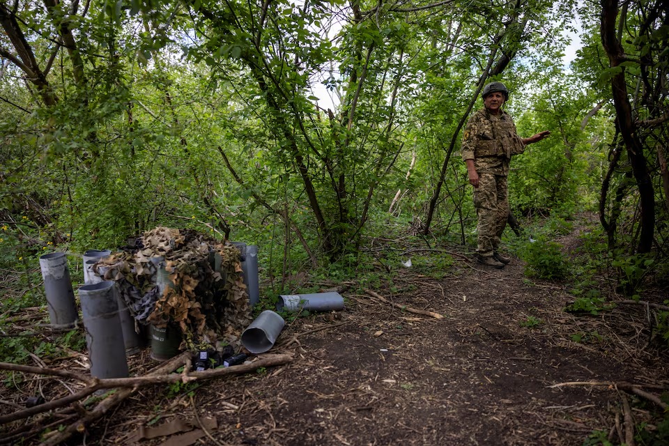 A Ukrainian servicemember of the 22nd Separate Mechanized Brigade stands near empty shell cartridges at an artillery position, amid Russia's attack on Ukraine, on the outskirts of Chasiv Yar, Ukraine. (Reuters)