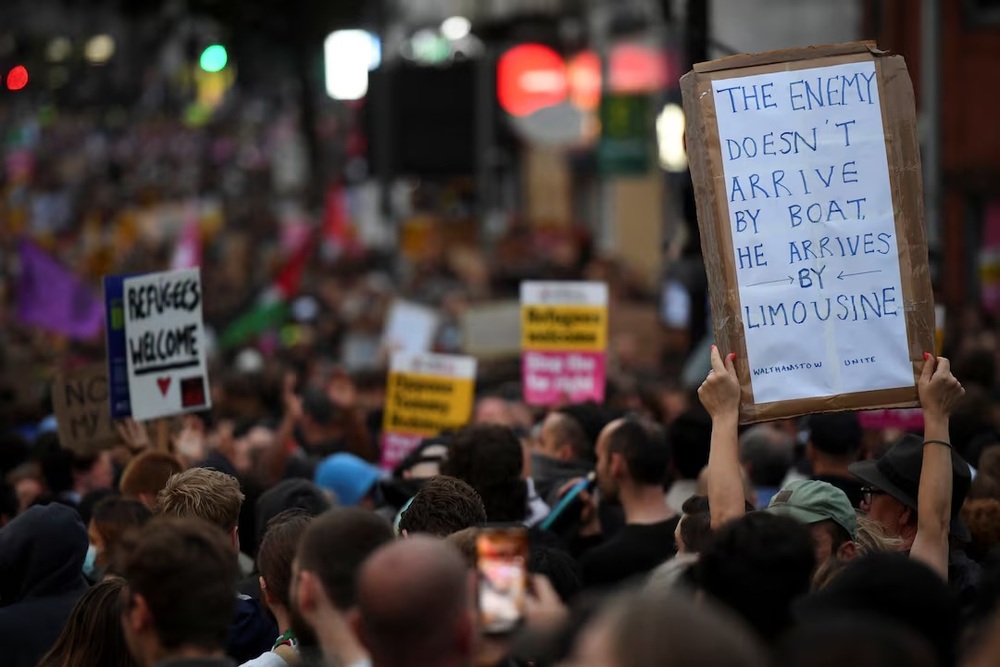 The reports prompted the deployment of thousands of police officers, and crowds of protesters massed in towns and cities including London, Bristol, Birmingham, Liverpool and Hastings, holding banners saying "Fight racism", "Stop the far right" and "Will trade racists for refugees".