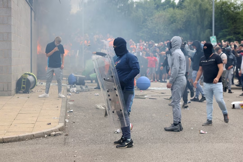 A demonstrator holds a shield during an anti-immigration protest, in Rotherham, Britain, August 4, 2024. (REUTERS/Hollie Adams/File Photo)