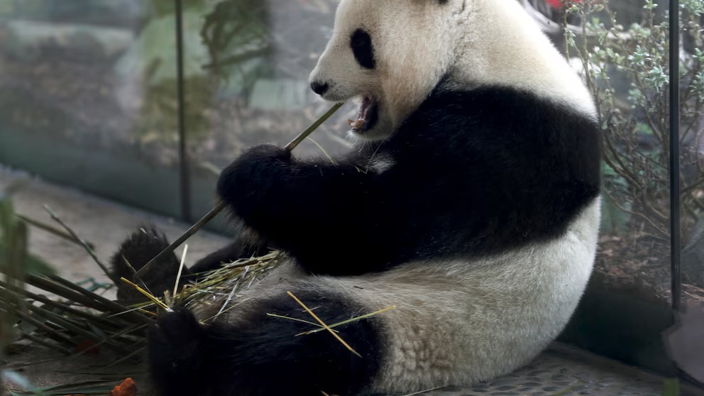 FILE -In this April 5, 2019 file photo taken through a window female panda Meng Meng eats bamboo at its enclosure at the zoo in Berlin, Germany. (AP Photo/Michael Sohn, file)