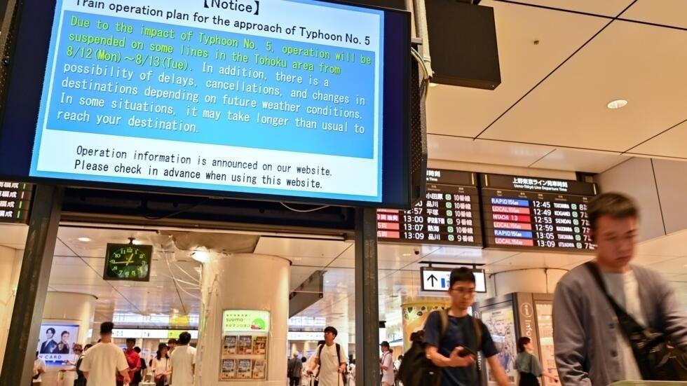 Japan grounded hundreds of flights and advised nearly 10,000 households to evacuate in some areas near Tokyo on Friday, as a strong typhoon caused power blackouts in the middle of a major summer holiday week.