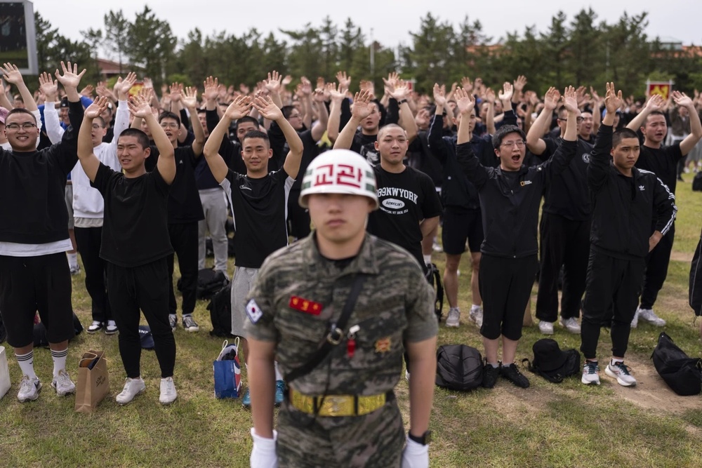 A vivid reminder that South Korea — for all its modern, high-tech veneer — is a country technically at war could be seen recently when hundreds of young men gathered at a military base in Pohang to begin 18 months of mandatory military service. The marine band played sentimental songs about parting from loved ones, and the young recruits, still in their civilian clothes and haircuts, knelt with their faces on the ground, to show their gratitude to friends and family in the review stands.