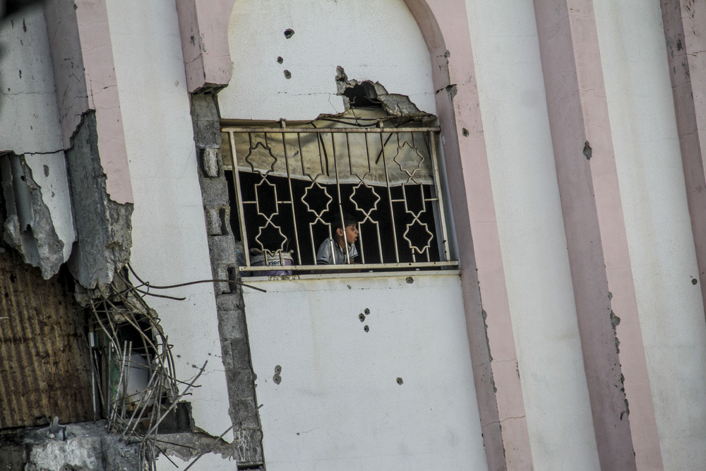 A boy looks out of a window in a damaged building after the Israeli army bombed a large square near Dar Al-Arqam School in the Sheikh Radwan area, northwest of Gaza City, on Sept. 14, 2024. (Xinhua)