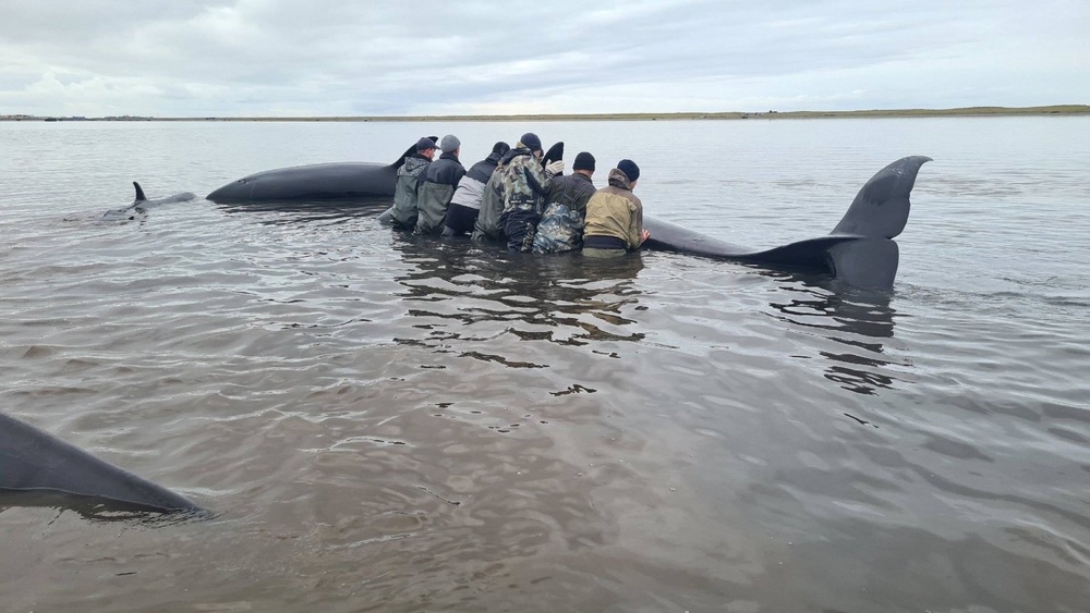 Russian researchers and volunteers spent all of Wednesday dousing the killer whales with water after they beached in the estuary on the Kamchatka Peninsula and when the tide rose managed to get the orcas to deeper water.