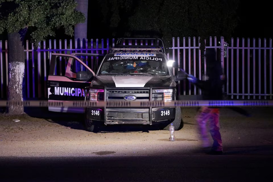 Authorities work in a crime scene where municipal police officers were shot dead by gunmen during a wave of violence in the state of Sinaloa, according to local media, in Navolato, Mexico, October 25, 2024. (Reuters)
