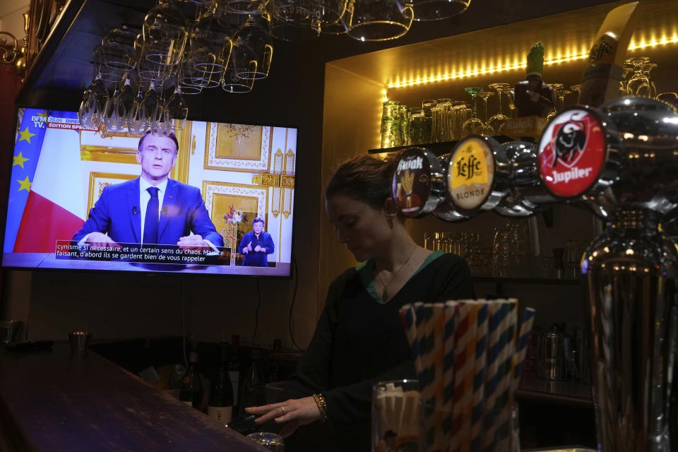 A waiter works as French President Emmanuel Macron addresses the nation following the resignation of ousted Prime Minister Michel Barnier, a day after a historic no-confidence vote at the National Assembly left France without a functioning government. Thursday, Dec. 5, 2024 in Versailles, outside Paris. (AP Photo/Michel Euler)