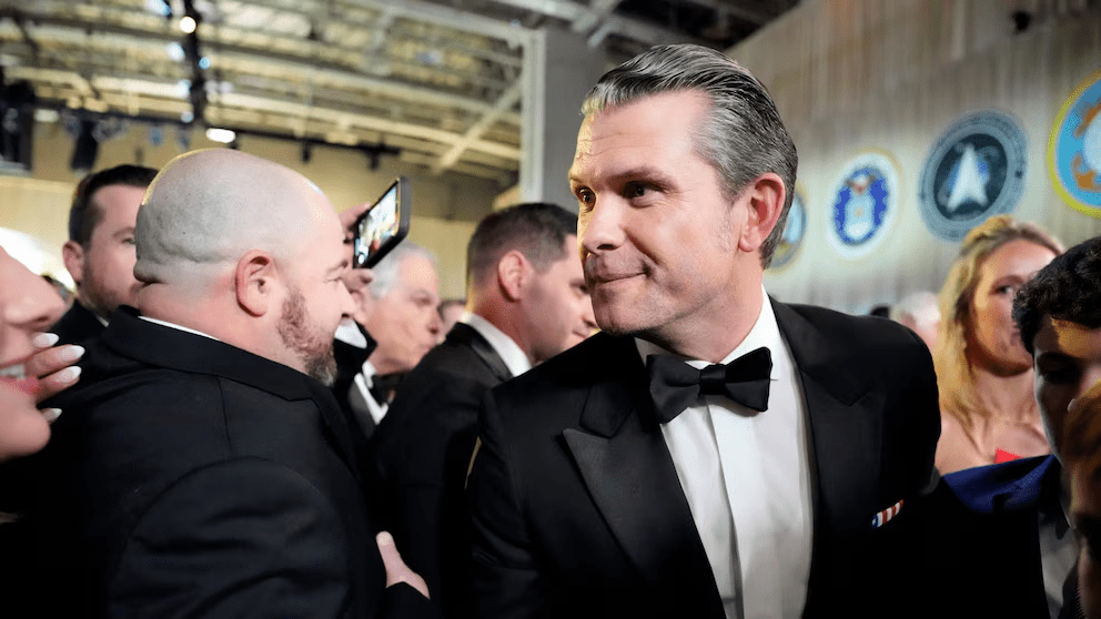 Defense Secretary nominee Pete Hegseth, center, attends the Commander in Chief Ball, Monday, Jan. 20, 2025, in Washington, after the 60th Presidential Inauguration. (AP Photo/Alex Brandon)