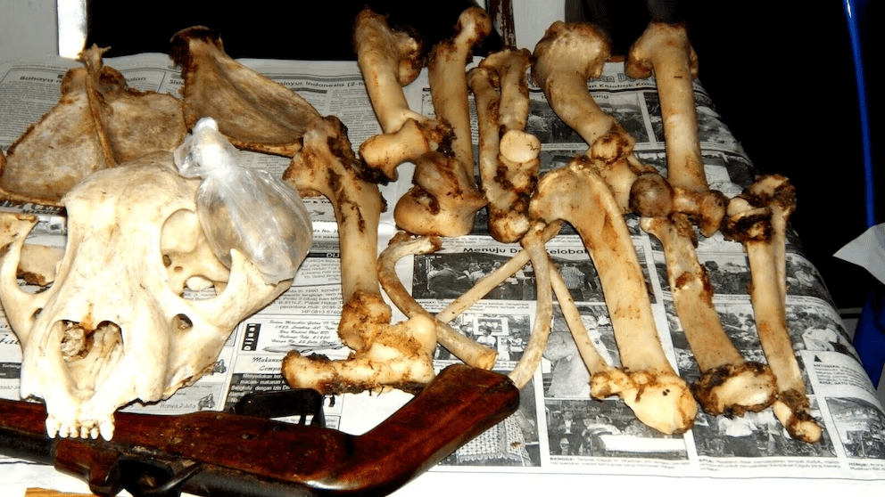 An undated photo of confiscated tiger bones displayed on a table in Sumatra, Indonesia. (Save the Tiger Fund/Panthera via AP)