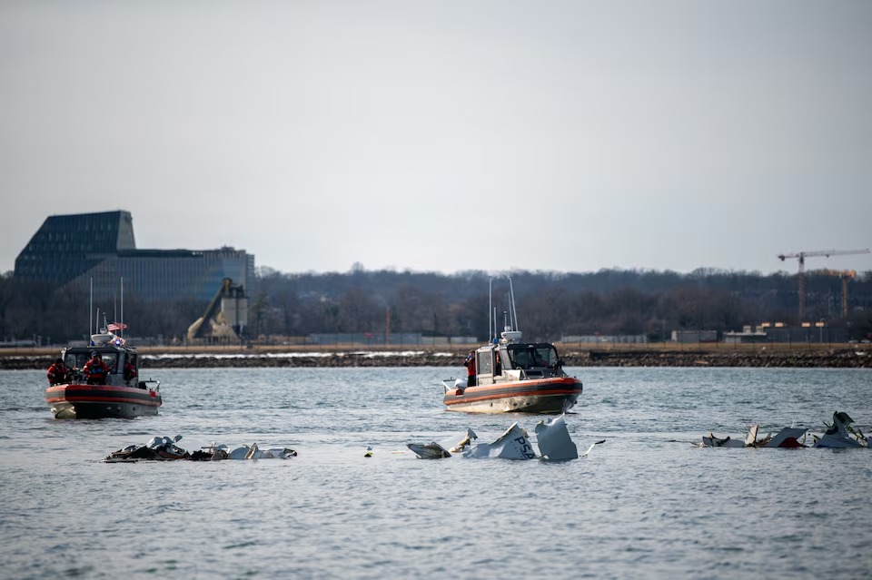 U.S. Coast Guard, along with other search and rescue teams, operate near debris at the crash site in the Potomac River in a location given as Washington, in the aftermath of the collision of American Eagle flight 5342 and a Black Hawk helicopter that crashed into the Potomac River, U.S. January 30, 2025. (Reuters)