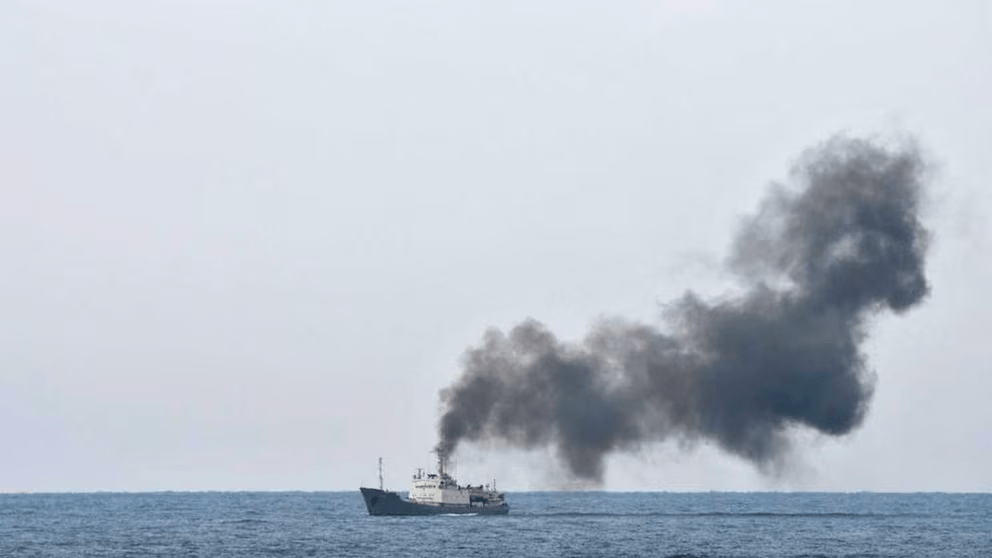 Military officials say this photo taken from a nearby vessel shows smoke rising from a fire aboard the Russian spy ship Kildin off the coast of Syria on Jan. 23, 2025. (AP Photo)