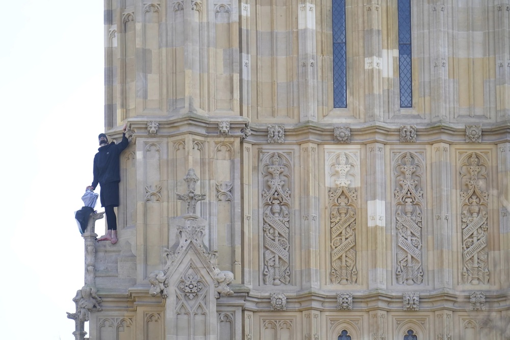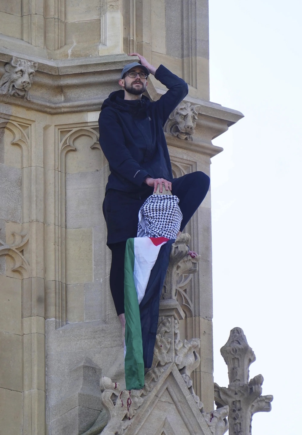 Traffic around the Palace of Westminster in London came to a standstill for much of Saturday as emergency crews tried to reach a man who climbed the Big Ben tower holding a Palestinian flag.