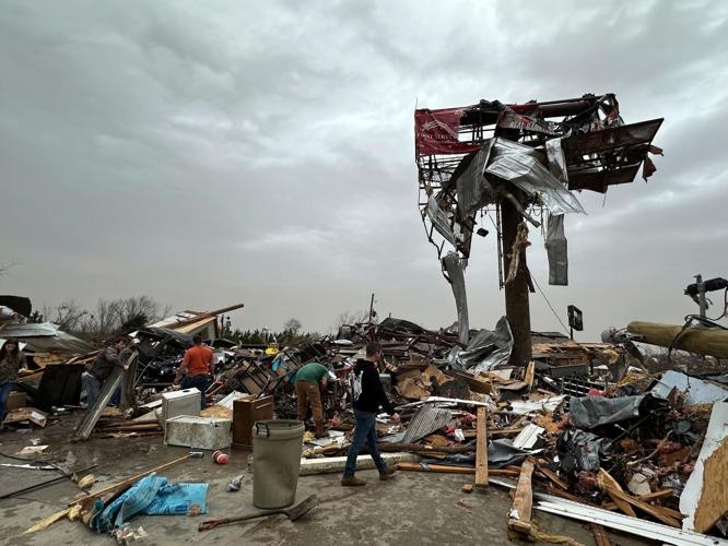 Dakota Henderson said he and others rescuing trapped neighbors found five bodies scattered in the debris Friday night outside what remained of his aunt’s house in hard-hit Wayne County, Missouri. Scattered twisters killed at least a dozen people in the state, authorities said.