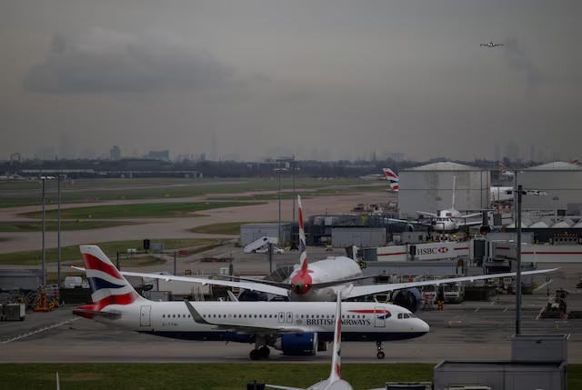 A passenger plane approaches a runway at Terminal 5 of Heathrow Airport, as the London skyline is seen in the distance, in Greater London, Britain, January 29, 2025. REUTERS/Chris J. Ratcliffe/File Photo