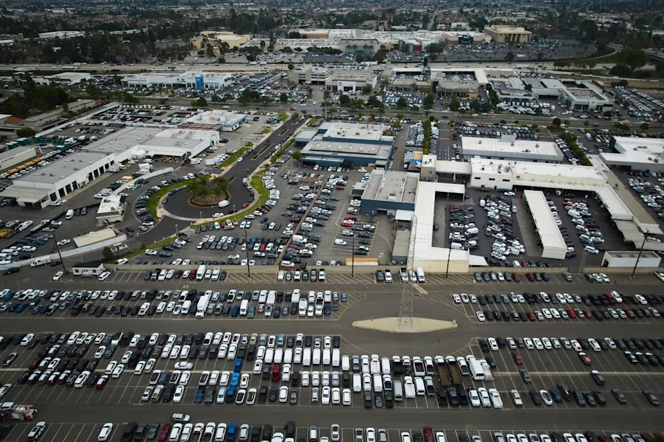 An aerial view shows auto dealerships in Cerritos, Calif., Thursday, March 27, 2025. (AP Photo/Jae C. Hong)