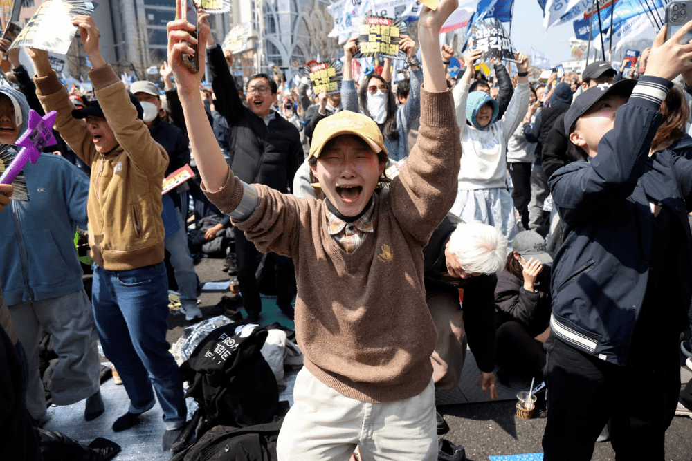 People celebrate after President Yoon Suk Yeol's impeachment was accepted, near the Constitutional Court in Seoul, South Korea, April 4, 2025. REUTERS/Kim Hong-ji
