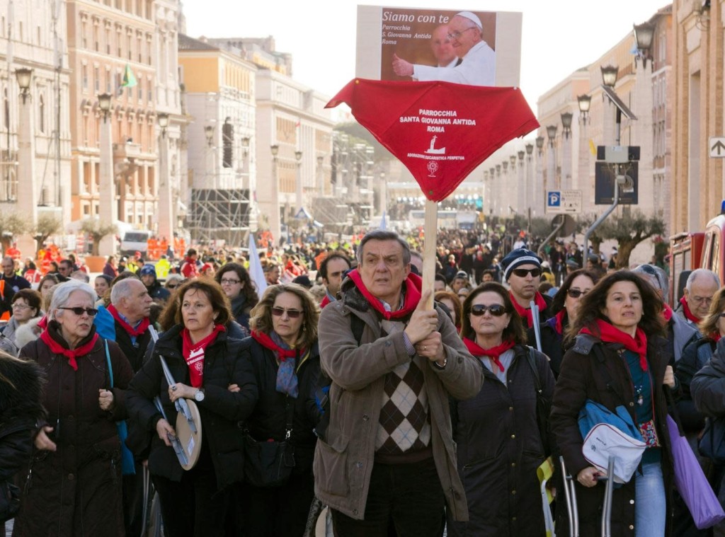 Catholics from the parish of St. Joan Antida in Rome arrive to attend Pope Francis’ inaugural Mass at the Vatican on March 19, 2013. AP Photo/Domenico Stinellis