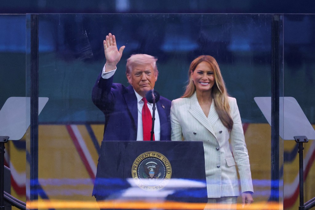 Thousands of spectators lined up along the route. Trump watched the proceedings from an elevated viewing stand behind bulletproof glass.