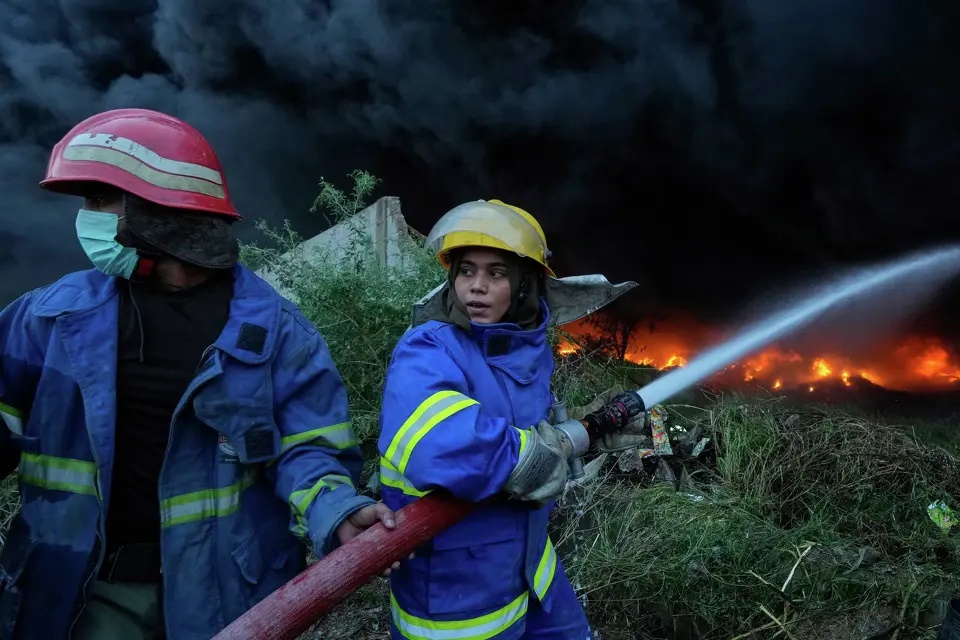 Female firefighter Syeda Masooma Zaidi, right, with her team member spray water to extinguish on a fire broke out in a storage facility packed vehicles tires, outskirts of Karachi, Pakistan, Thursday, Oct. 30, 2025. Fareed Khan/AP