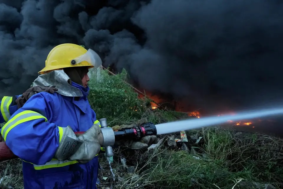 Female firefighter Syeda Masooma Zaidi sprays water to extinguish on a fire broke out in a storage facility packed vehicles tires, outskirts of Karachi, Pakistan, Thursday, Oct. 30, 2025. Fareed Khan/AP