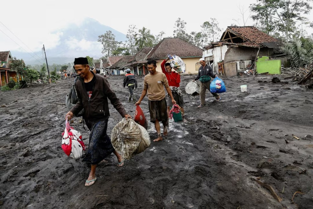 Local residents carry valuable goods from their houses in an area affected by an overnight Mount Semeru volcano eruption, in Supiturang village, Lumajang, East Java province, Indonesia, November 20, 2025. REUTERS/Dipta Wahyu