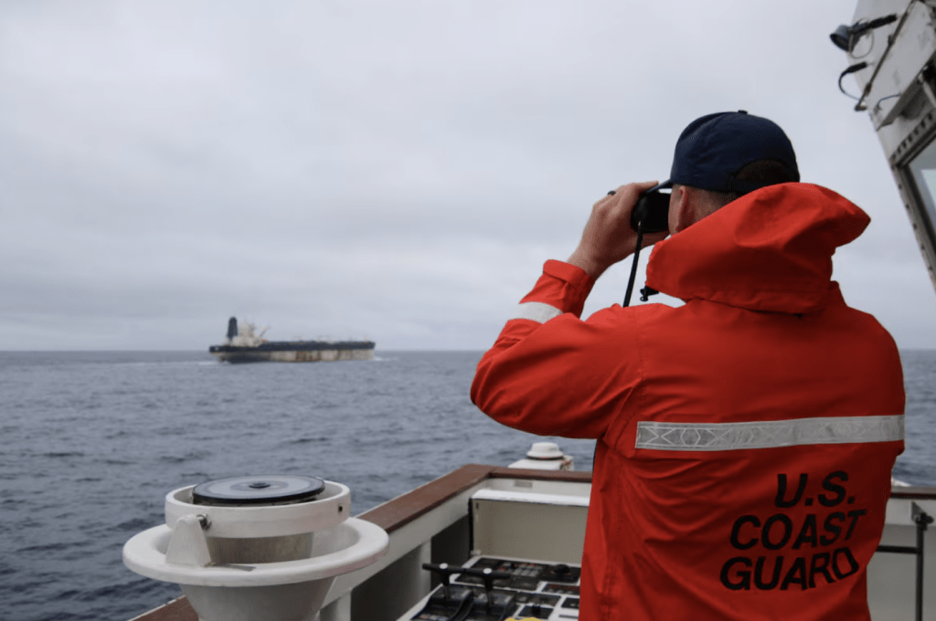 A U.S. Coast Guard official looks through binoculars at the ship Marinera (Ex-Bella 1). Reuters
