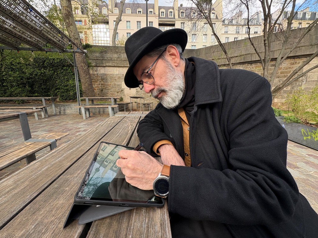Photo by JIHAN AMMAR / AFP Exiled political cartoonist Kianoush Ramezani sketches on his digital tablet in Paris on March 26, 2026.