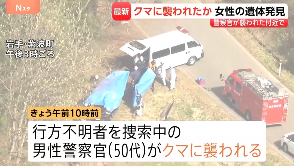 A police officer was mauled by an adult black bear while searching for a missing woman in the mountains of Iwate Prefecture on Tuesday, with a severely damaged female body later found near the scene, authorities said.