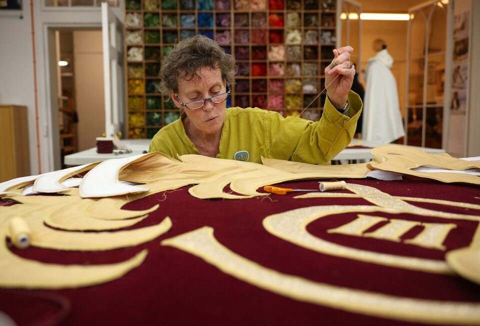 In a studio inside London's Hampton Court Palace, hand embroiderer Marg Dier carefully stitches fabric foliage around King Charles III's cypher. The shiny gold insignia will adorn a new pair of stage curtains that will open and close performances at London's Royal Opera House.