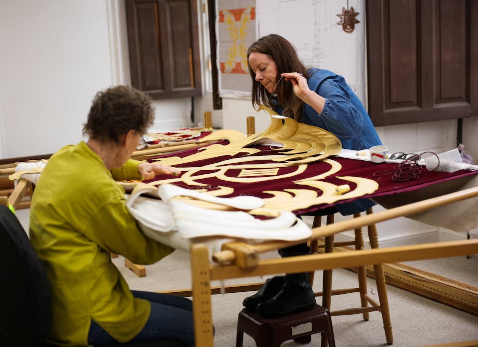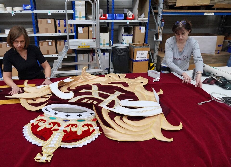Senior studio embroiderer Helen Stevens and Marg Dier hand‑stitch the royal cypher of Britain's King Charles for the new Royal Opera House stage curtains at the Royal School of Needlework, based at Hampton Court Palace, ahead of their unveiling in May 2026, in London, Britain, March 4, 2026. REUTERS/Isabel Infantes