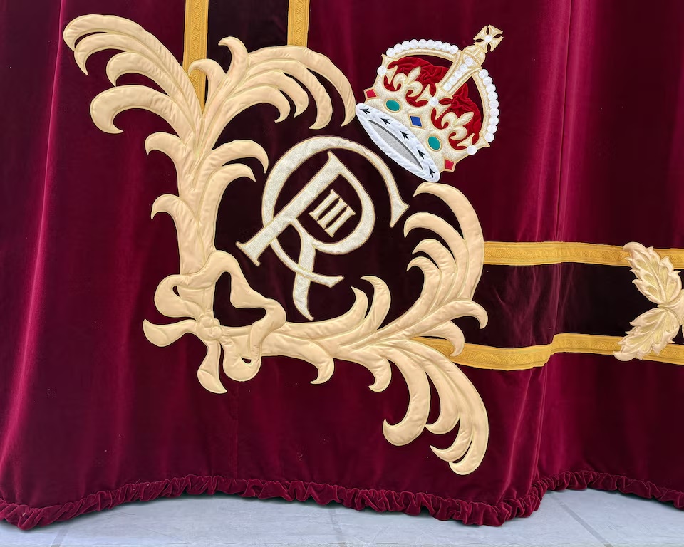 The new ones are once again a collaboration between the Royal School of Needlework, whose team is stitching the corner decor depicting the cypher – the initials 'C' and 'R', Charles' regnal number in Roman numerals plus the Tudor crown – and German stage equipment specialist Gerriets, which is making the deep red curtains.