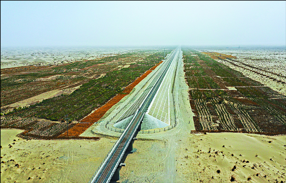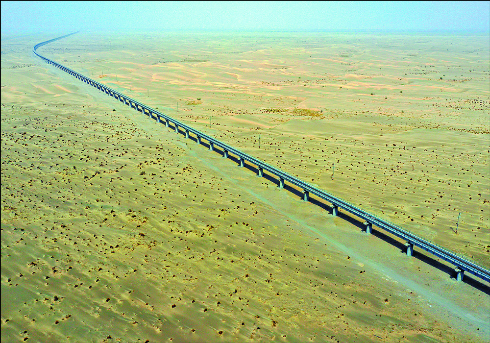 Five viaducts with a length of 49.7 km lift the railway to protect it against sandstorms, 50 million square meters of grass grids have been laid and 13 million trees including rose willow and sea buckthorn planted.