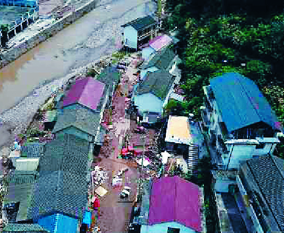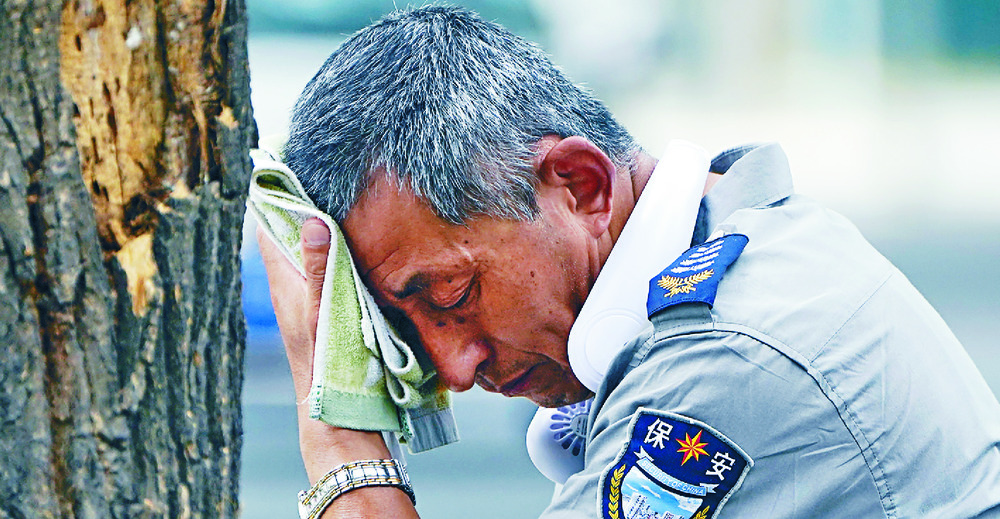 A security guard wipes his sweat on a hot day in Beijing and people clean up silt and garbage in Xiangxi, Hunan, where flash floods damaged houses. AP