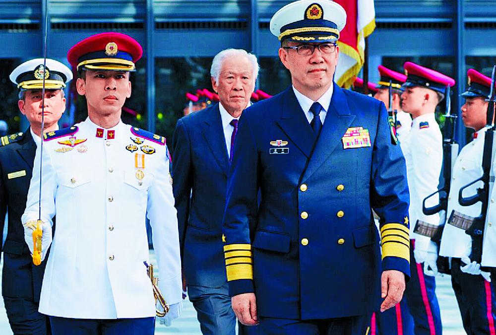 Defense minister Dong Jun inspects an honor guard in Singapore. BLoOMBERG