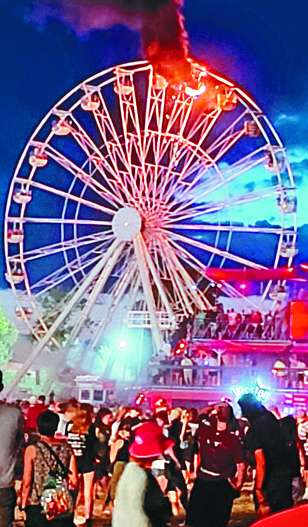 At least 23 people were injured when two gondolas of a Ferris wheel caught fire at a music festival near Leipzig in Germany, news agency dpa reported yesterday.Four people suffered burns and one was injured in a fall. Others, including first responders and at least four police officers, had to be examined for possible smoke inhalation.